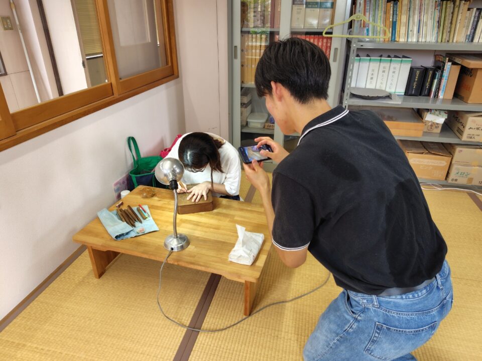 9月9日(火)、文教大学教育学部の学生が、ゼミ活動の一環で新潟県内の伝統文化や地域づくりの工夫を取り上げ、新潟県版の小学校4年生向けの副読本(教科書の補助教材)作成に取り組んでいることから、村上市の伝統的工芸品である村上木彫堆朱に着目し、職人の技術や地域との関わり、文化伝承のための取り組みについて取材に来ました。彫り師の高橋さんのことは実際に彫っているところの写真も撮っていました。